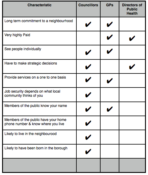 Thanks Chim – yeh you have identified an area that I struggled with – I do think that many good councillors would see there role as advocating and helping their constituents tackle really complex local problems – I think that GPs are probably more likely to see their role as responding to those that have a clear clinical solution.