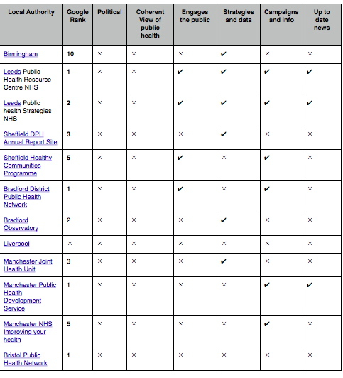 So on the basis of the above I created a set of criteria and used these to rate the public health websites of the six biggest (by population) local authority areas in England.