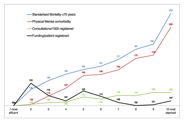 This is concerning. In Sheffield we have started an exciting piece of work with practices who serve the poorest parts of the city. We recently invited Professor Graham Watt down from the Glasgow Deep End Group. Their work as is shown by the graph below (Scottish data) shows that practices serving the poorest communities are likely to receive less funding yet face much greater demands than practices serving wealthier areas.