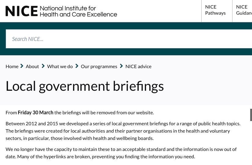 It is quite understandable that local councillors have little interest in much of the guidance that is produced by NICE. Having said that I think that when it existed the Centre for Public Health at NICE must have recognised this problem because they produced a series of Local Government Briefings that attempt to speak to local authorities in their system role. While I think they still struggled with the operational nature of NICE evidence nonetheless they strike me as an attempt to reach out to system leaders like Councillors.