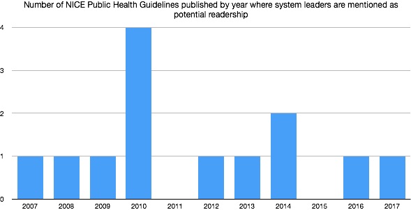 Most NICE guidance focusses on areas 1 and 2; however, NICE Public Health Guidance for understandable reasons has a greater focus on areas 2 and 3. Even here emphasis is more on services rather than systems. I have looked at the 65 NICE public health guidelines of these only 13 specifically mention that the intended readership includes system leaders such as elected members, Health and Wellbeing Boards, Local Strategic Partnerships etc. My working out is here.