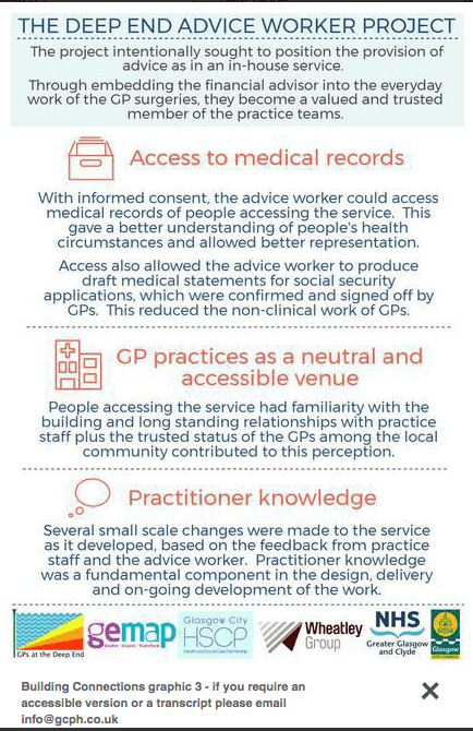 Similarly GPs can help by giving Citizens Advice access to patient data – as Dan Hopewell from Bromley By Bow explained in his comments on my earlier blog when he drew attention to an example from the Glasgow Deep End Group.