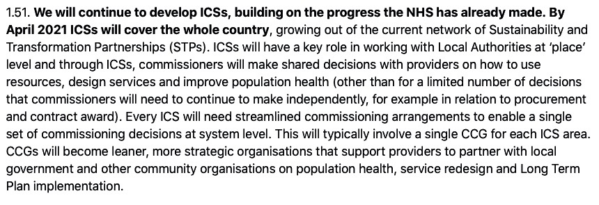 This paragraph states that by April 2021 (just over 2 years away) Integrated Care Systems – will cover the country and that each Integrated Care System will typically involve one Clinical Commissioning Group which will be leaner and more strategic organisations that support providers to partner with local government and other community organisations.