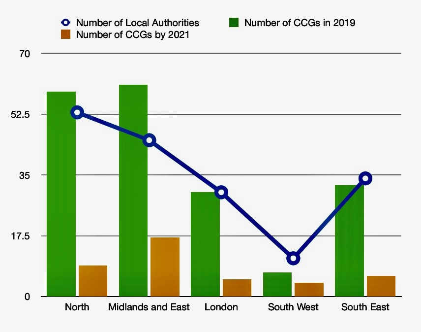 As the graph shows currently the number of CCGs by NHSE region are roughly comparable with the number of local authorities – so, generally speaking the NHS and local authorities have similar governance geographies. This changes radically in the new world.