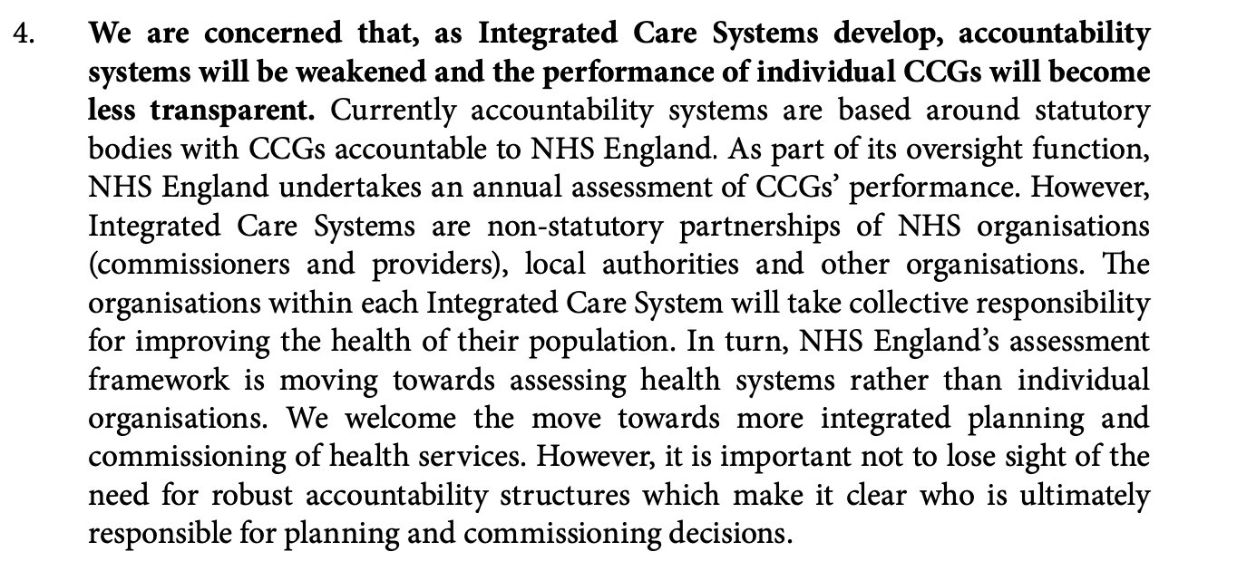 Second building on the CCG role at place level means that there is a good fit with local authority structures and accountabilities – this is how we do local democracy. It’s not perfect – but it is certainly better than moving everything up to sub-regions. As the paragraph below from the report of the Governments Public Accounts Committee in 2019 in 2019 on CCGs notes: