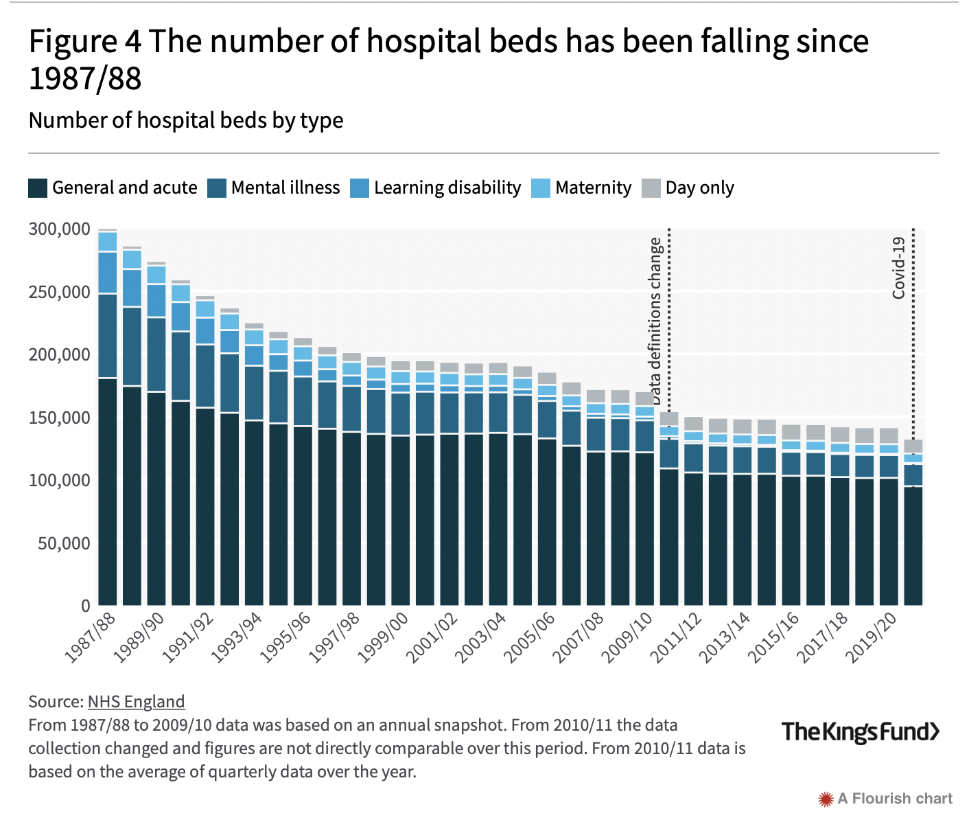 According to my maths – England has a population of 56 million which equates to (560*45) the creation of a minimum of 25,200 virtual beds in England. According to the Kings Fund, England has experienced a significant decline in acute hospital beds and currently has just over 100,000.